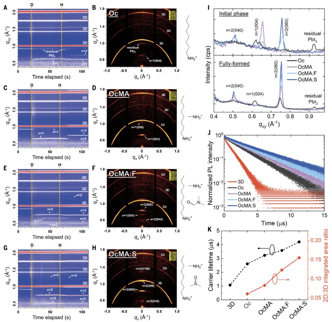 (A至H) 通过原位掠入射广角X射线散射(GIWAXS)分析不同溶剂体系(Oc、OcMA、OcMA:F、OcMA:S)的二维钙钛矿形成过程:(A, C, E, G) 初始相组成;(B, D, F, H) 退火后的最终相组成。OcMA:S体系(G, H)在退火后自发形成纯相二维(n=2)钙钛矿,无残留PbI₂或n=1相。(I) 二维(n=2)相的结晶度量化(基于积分峰面积比)。(J, K) 载流子寿命与二维结晶度的相关性:OcMA:S体系的载流子寿命(4205 ns)较裸三维钙钛矿(1067 ns)提升394%。