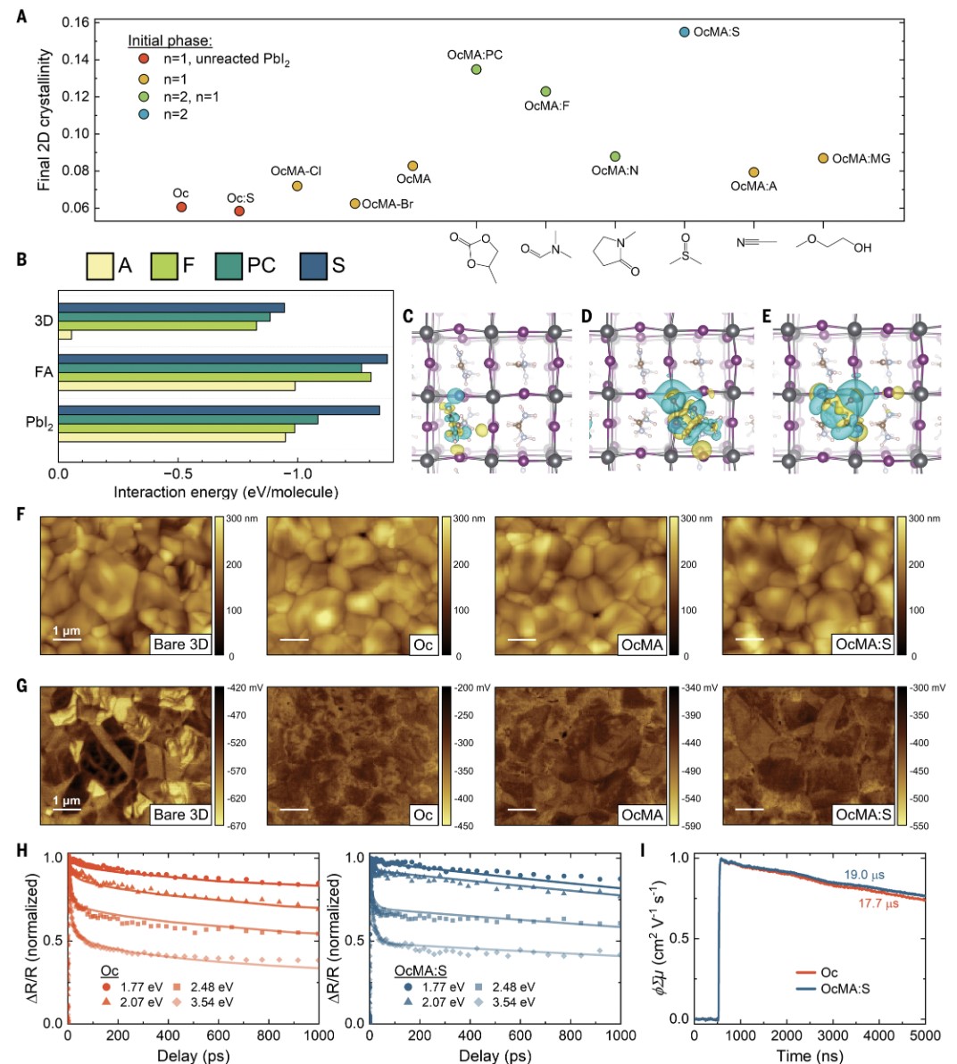 (A) 不同溶剂体系(OcMA:F、OcMA:N等)的二维结晶度与初始相分布关系图。(B) 溶剂分子与三维钙钛矿表面的结合能计算(单位:eV/分子)。(C至E) 三维钙钛矿表面与乙腈(C)、碳酸丙烯酯(D)、二甲基亚砜(E)结合的分子动力学模型。(F, G) 原子力显微镜(AFM)形貌(F)与开尔文探针力显微镜(KPFM)电位分布(G):OcMA:S体系的晶内电位均匀性显著优于对照组。比例尺:1微米。(H) 瞬态反射光谱(TRS)显示OcMA:S体系的载流子扩散速率更快(50 ps内50%载流子迁移)。(I) 瞬态微波电导(TRMC)表明二维层对三维体相载流子寿命影响有限