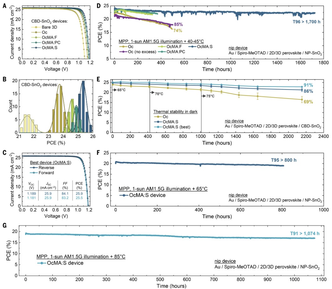 (A) 基于不同二维/三维结构的冠军器件电流密度-电压曲线(CBD-SnO₂基底)。(B) 器件效率分布直方图。(C) OcMA:S冠军器件(效率25.9%)的滞后效应可忽略。(D) 最大功率点(MPP)跟踪下器件稳定性:OcMA:S器件在40–45°C下运行1700小时保持96.4%初始效率。(E) 暗态热稳定性测试(65–75°C):OcMA:S器件2100小时后效率保持86%。(F, G) 高温MPP跟踪:65°C下800小时(95%保持率)、85°C下1074小时(91%保持率)。
