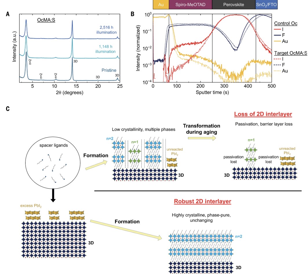 (A) 老化后OcMA:S器件的XRD图谱:二维(n=2)相在2500小时光照后未发生相变。(B) 飞行时间二次离子质谱(ToF-SIMS)深度剖析显示,二维层降解后离子(如I⁻)向传输层扩散加剧。(C) 二维层演化示意图:对照组(Oc)的混合相逐渐分解为n=1相和PbI₂,而OcMA:S体系保持纯相二维结构。