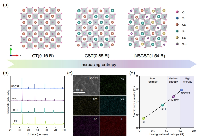 首次将高熵材料设计理念引入钙钛矿型CaTiO₃陶瓷中,通过A位多元素共掺杂(Na、Sm、Sr等)提高构型熵(最高达1.54 R),诱导晶格畸变和原子无序,显著促进氧空位(V<sub>O</sub>)和Ti³⁺缺陷的生成。