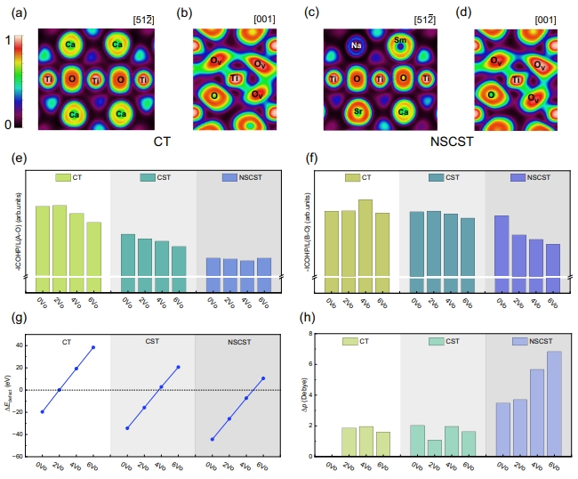 通过DFT计算和实验验证,揭示了高熵体系中化学键强度与缺陷形成的关联:A-O和B-O键的弱化降低了氧原子逃逸势垒,促进氧空位生成。