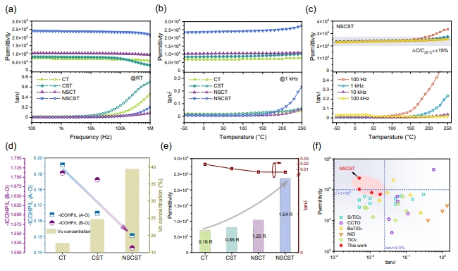 在高熵陶瓷(NSCST)中实现介电常数2.37×10⁵,为同类材料中最高值之一,同时保持超低损耗(tanδ=0.005)和宽温稳定性(-50–250°C内ΔC/C<25°C<±15%)。