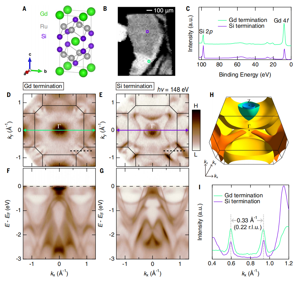 图1 GdRu2Si2的表面终端及其电子结构。(A)GdRu2Si2的晶体结构。(B)通过每 20 μm 扫描光束斑获得的解理面费米能(EF)附近的光发射强度空间映射。(C)在(B)中绿色和紫色圆圈标记的两个斑点处进行的芯能级测量。(D 和 E)Gd(D)和 Si(E)在 10 K 下用 148 eV 光子(对应 Γ 点处 k_z=20π/c)测量的费米面映射。(F 和 G)分别为 Gd和 Si沿穿过 Γ 点的动量切割(D 和 E 中的绿色和紫色箭头)测量的能带色散图。(H)计算的体态费米面。(I)D 和 E 中黑色虚线处的动量分布曲线(MDC)。© 2025 Science