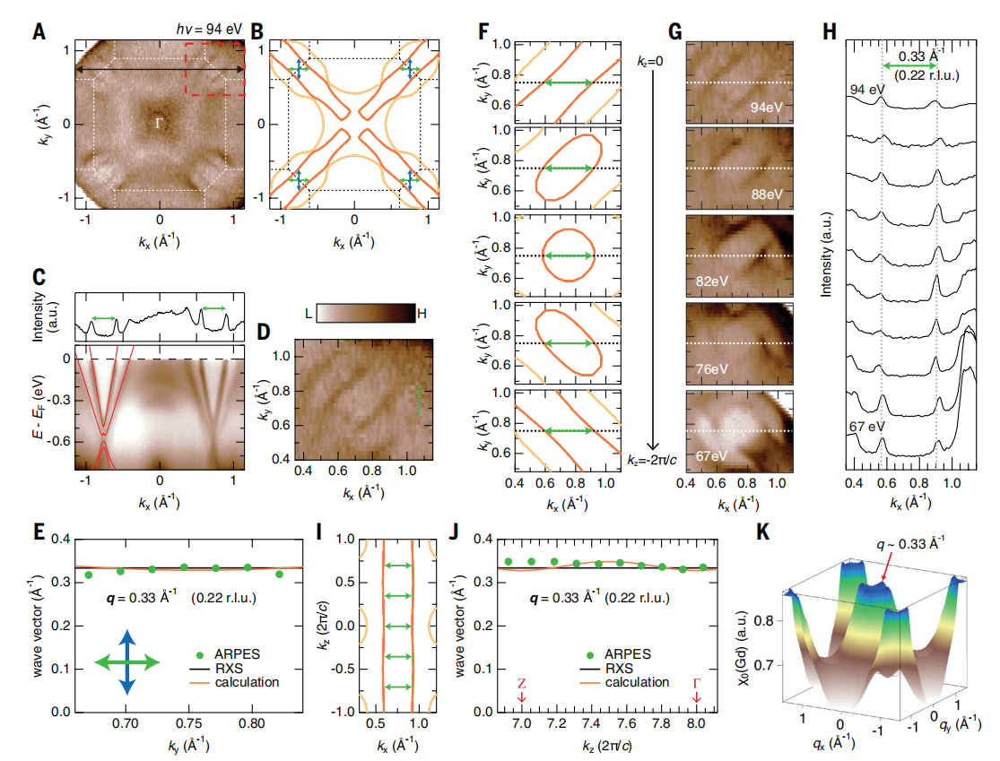 图2三维动量空间中的费米面嵌套。(A)Gd 终端在 10 K 下用 94 eV 光子(对应 kz=0)测量的面内费米面映射。(B)kz =0处的计算费米面。A 和 B 中的白色和黑色虚线分别表示布里渊区。绿色和蓝色箭头表示平行于kx和ky方向的嵌套波矢。(C)连接布里渊区角落的动量切割的能带色散图(A 中的黑色箭头)。顶部:费米能级处的相应 MDC。叠加了 DFT 体带计算(红线)。(D)A 中红色矩形区域的费米面放大图。(E)ARPES 估算的沿kx方向的嵌套波矢长度(绿圈)和计算值(红线)随ky位置的变化。ARPES 结果的ky位置由色散图中的绿点标记。RXS 研究报告的磁调制 q 矢量长度也叠加(黑线)。(F 和 G)分别为计算和 ARPES 显示的嵌套面内费米面随kz(0 到 – 2π/c)的演化。通过改变光子能量从 94 eV 到 67 eV,kz值从 0 变为 – 2π/c。注意,由于 GdRu2Si2具有体心四方结构,沿kz方向的布里渊区周期为 4π/c。(H)在覆盖 kz从 0 到 – 2π/c 的不同光子能量下,沿 G 中白色虚线的嵌套费米面的 MDC。绿色箭头通过将光子能量从 94 eV 扫至 67 eV,连接 16π/c(=0)到 14π/c(=-2π/c)。(I)沿布里渊区角落的kx方向嵌套费米面的kz依赖性。绿箭头与 F 中的相同。(J)同 E,但为沿kz位置的费米面嵌套。(K)从三维 DFT 体带结构估算的 Gd 轨道分量的林哈德函数 χ₀(Gd)。© 2025 Science