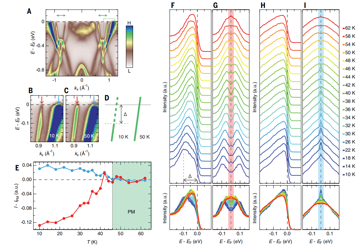 图3嵌套费米面上的赝能隙及其温度演化。(A)Si 终端沿连接布里渊区角落的动量切割的能带色散图,捕捉了费米面的嵌套部分。光子能量为 148 eV,对应 kz=0。绿色箭头表示费米面嵌套波矢。(B 和 C)分别为低于(T=10 K)和高于(T=50 K)奈尔温度(46 K)时 A 中绿色矩形区域的能带色散放大图。红色和蓝色箭头分别指向嵌套和非嵌套能带。(D)嵌套能带在TN以下和以上(分别有和无赝能隙)的示意图。(E)嵌套(红点)和非嵌套(蓝点)能带在 EF 附近的谱重随温度的演化;每个都是 G 和 I 中红色和蓝色阴影区域(±30 meV)内的谱强度积分。(F 和 H)分别为嵌套和非嵌套能带在kF处(B 和 C 中的红色和蓝色箭头)不同温度下测量的能量分布曲线(EDC)。上下图分别为有和无偏移的 EDC 图。(G 和 I)分别为 F 和 H 中 EDC 关于 EF 的对称化图。© 2025 Science