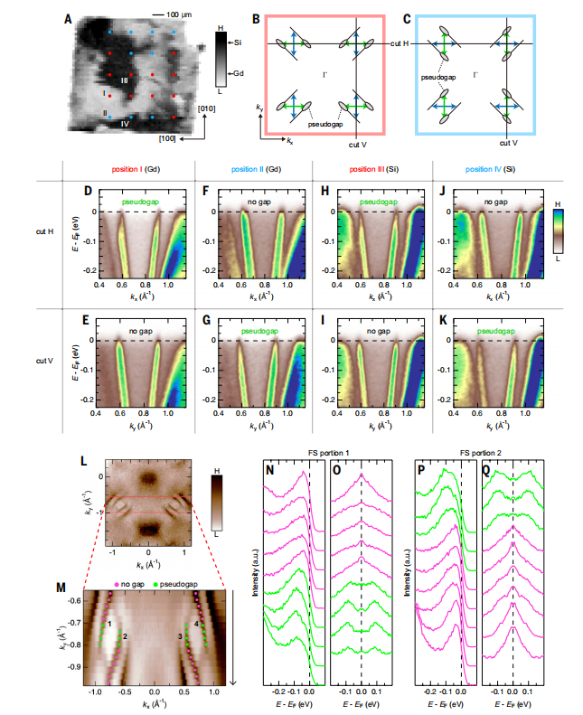 图4磁畴依赖的赝能隙。(A)GdRu2Si2表面光发射强度的空间映射。黑色和灰色区域(高强度和低强度)分别表示 Si 和 Gd 终端。(B 和 C)两种不同磁畴的费米面示意图,分别对应 A 中的红点和蓝点。在红点磁畴中,赝能隙仅沿水平切割(cut H)出现;在蓝点磁畴中,赝能隙仅沿垂直切割(cut V)出现。(D 到 K)A 中标记为 I、II、III 和 IV 的四个斑点的能带色散图。上排(D 到 J)为沿 cut H 的结果,下排(E 到 K)为沿 cut V 的结果。每个面板标注了是否观察到赝能隙。(L)Gd 终端在 10 K 下用 148 eV 光子测量的费米面映射及对应 B 的磁畴。(M)L 中红色矩形区域的费米面放大图。追踪了四个费米面部分 1 到 4 的赝能隙动量演化。有赝能隙和无赝能隙的kF点分别用绿点和品红点标记。(N 和 P)分别为费米面部分 1 和 2 在kF处的 EDC。从上到下,EDC 按ky值从大到小排列,如 M 中的黑色箭头所示。(O 和 Q)分别为 N 和 P 中 EDC 关于 EF 的对称化图。© 2025 Science
