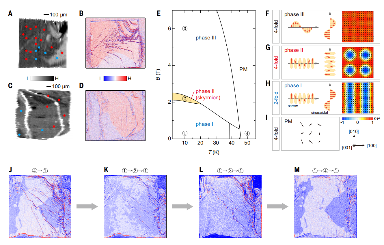 图5磁场和温度循环对磁畴的操纵。(A 和 C)分别为样品 1 和 2 通过 ARPES 确定的磁畴。每个光发射强度空间映射上标记了 ARPES 测量的斑点。红色和蓝色表示不同磁畴。(B 和 D)通过偏振显微镜观察的磁畴。图像绘制了奈尔温度以下(10 K)和以上(50 K)的强度差,显示两种磁畴(红色和蓝色区域)。(E)GdRu2Si2的磁相图。(F 到 I)分别为相 III、II、I 和顺磁相(PM)的自旋织构示意图。仅相 I 具有二重磁结构。(J 到 M)偏振显微镜在不同温度和磁场循环步骤后观察到的磁畴:从 50 K 冷却到 10 K(J);激发到相 II 后返回相 I(K);激发到相 III 后返回相 I(L);从 10 K 升温到 50 K 再降温回 10 K(M)。磁场循环使用脉冲磁场。© 2025 Science