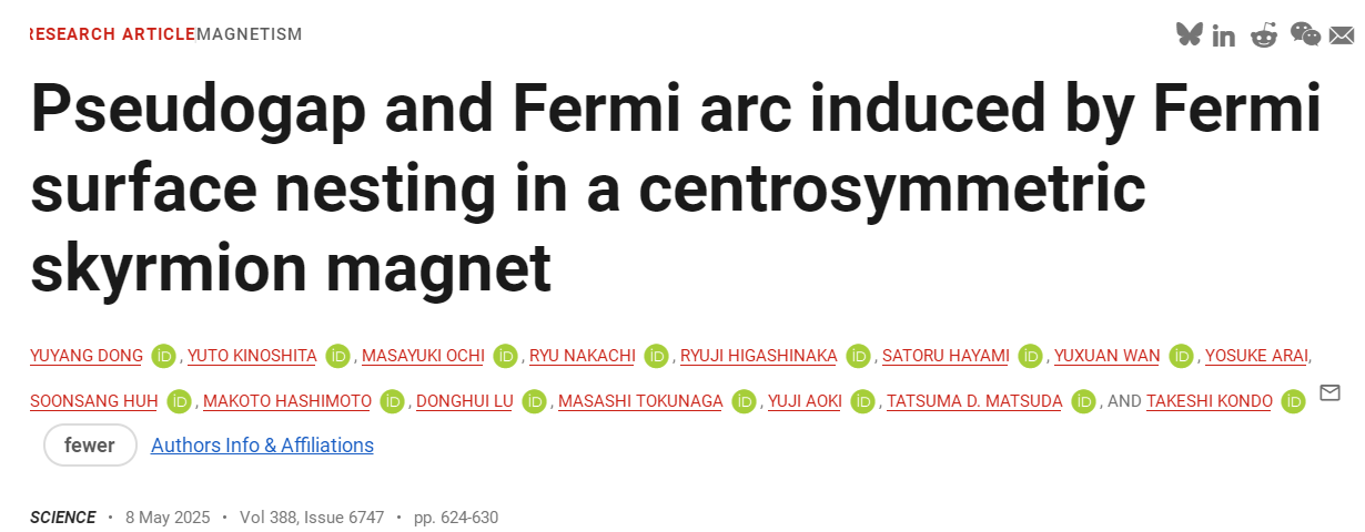 原文详情:Dong Y, Kinoshita Y, Ochi M, et al. Pseudogap and Fermi arc induced by Fermi surface nesting in a centrosymmetric skyrmion magnet[J]. Science, 2025, 388(6747): 624-630. https://doi.org/10.1126/science.adj7710
