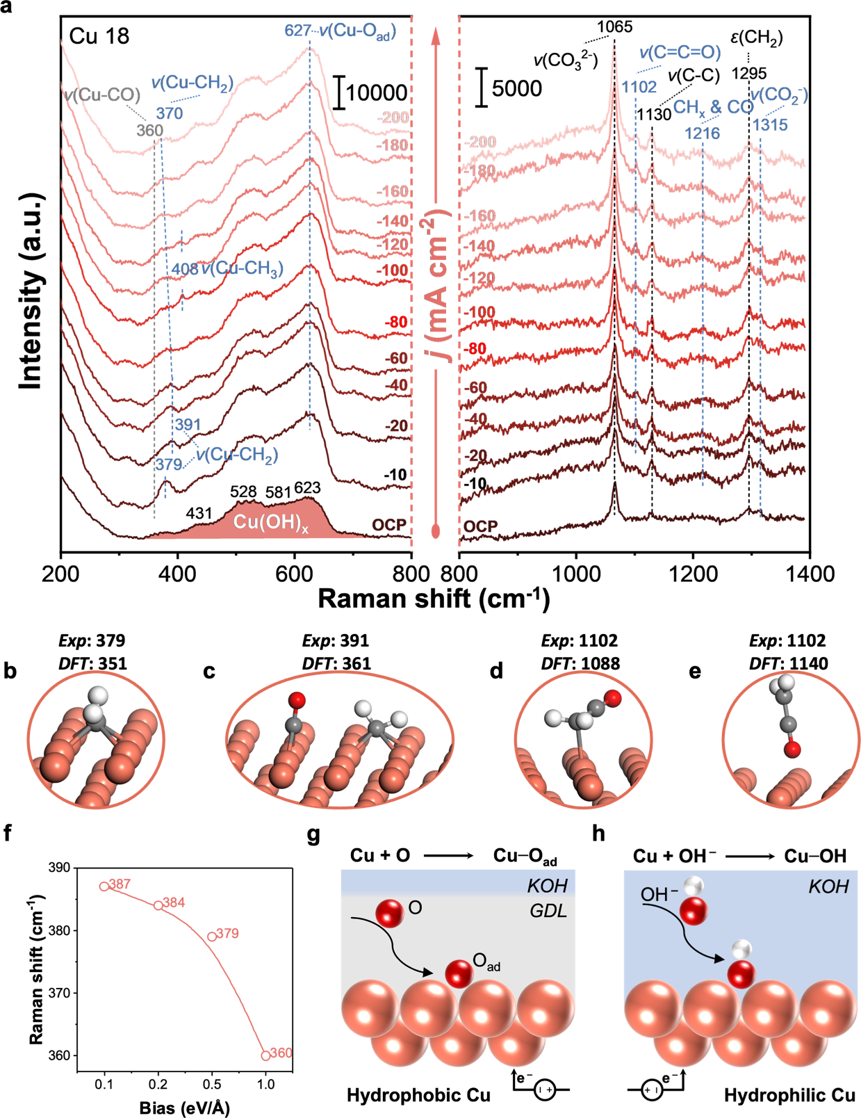 图4. Cu 18的原位拉曼及DFT吸附构型分析 (a) 200–1400 cm⁻¹区间的拉曼光谱。 (b-e) Cu(100)表面吸附CH₂、共吸附CO与CH₂,以及CH₂CO构型。 (f) 电压对Cu-CH₂拉曼位移的影响。(g, h) Cu−Oad与Cu−OH形成过程示意图。