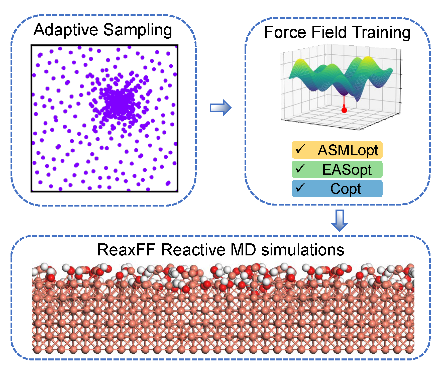团队提出一种基于自适应采样的ReaxFF力场优化策略,突破传统优化方法对初始猜测依赖强、效率低的问题。该方法显著提高了参数优化的效率与精度,并成功模拟铜表面在水作用下的重构机制,与实验结果高度一致,为复杂反应体系的精准建模提供了新方法学支撑。