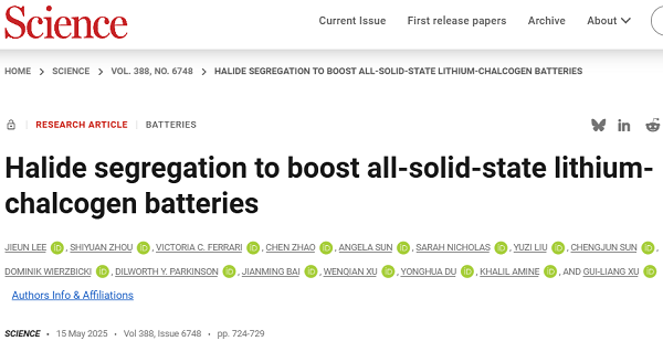 原文详情:Halide segregation to boost all-solid-state lithium-chalcogen batteries (Science 2025, 388, 724-729, DOI: 10.1126/science.adt1882)
