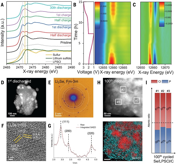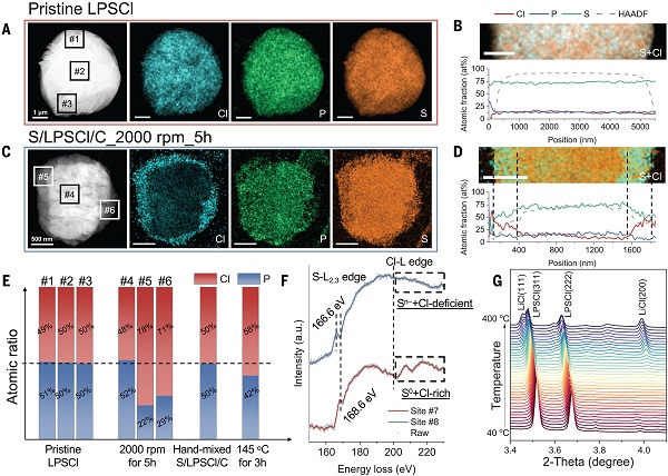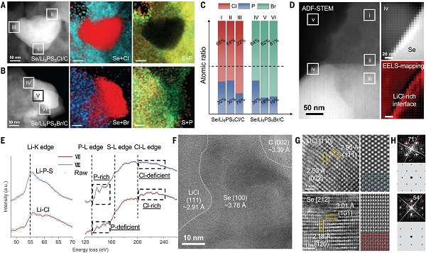 基于以上难题,美国阿贡国家实验室徐桂良研究员、Khalil Amine教授等人在Science上发表了题为“Halide segregation to boost all-solid-state lithium-chalcogen batteries”的论文,报道了在各种含卤素的固态电解质和高能量硫族化合物正极材料之间,通过超高转速(UHS)混合过程中的机械化学反应实现的界面处卤化物的普遍分离现象。具体的,受混合卤化物钙钛矿太阳能电池中光诱导相分离的启发,研究人员观察到在一系列含卤素的SSEs和高能量硫族(S、Se、SeS2、Te)正极材料之间,通过2000 rpm的超高转速混合实现了普遍的卤化物分离。UHS混合产生的热冲击和剪切破碎的协同效应,使得在混合过程中能够诱导机械化学反应,从而实现从含卤素的SSEs中分离卤化物,并在正极颗粒上均匀沉积。这种结构增强了电荷传输动力学,提高了界面稳定性,并减轻了固态电池的机械故障。使用低温透射电子显微镜和同步辐射X射线衍射和光谱技术证实了卤化物偏析的形成和有效性。制备的各种ASSLSBs在商业水平的面积容量下表现出接近100%的硫利用率和非凡的循环稳定性。