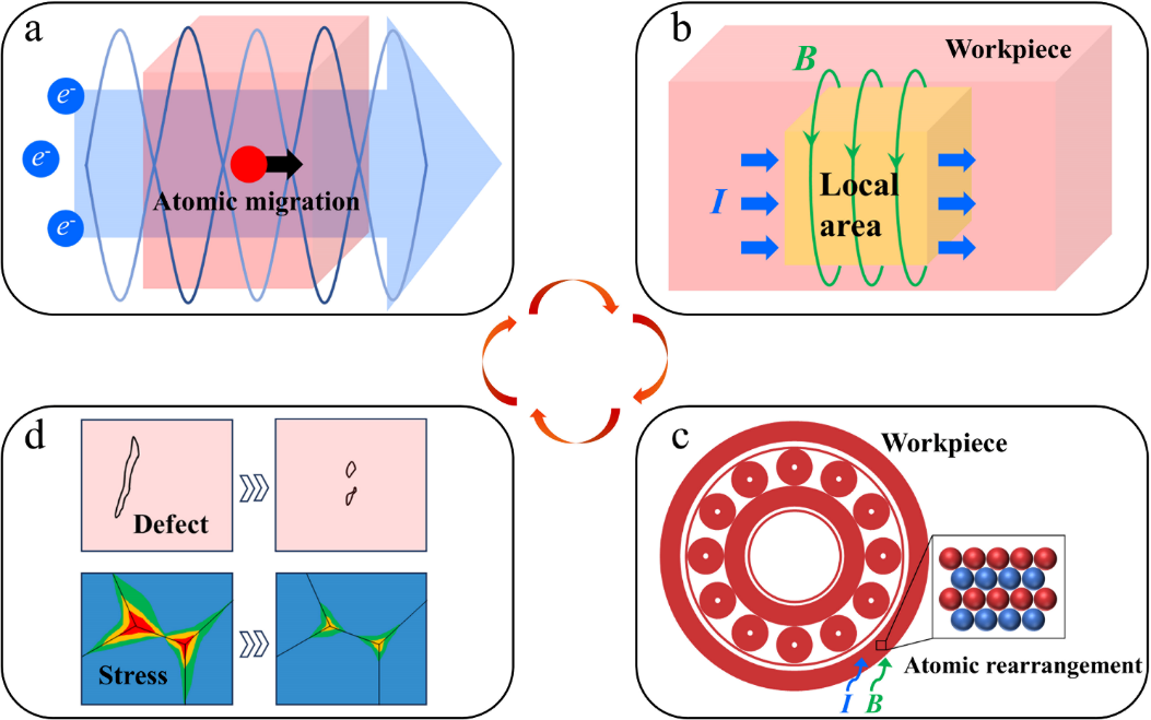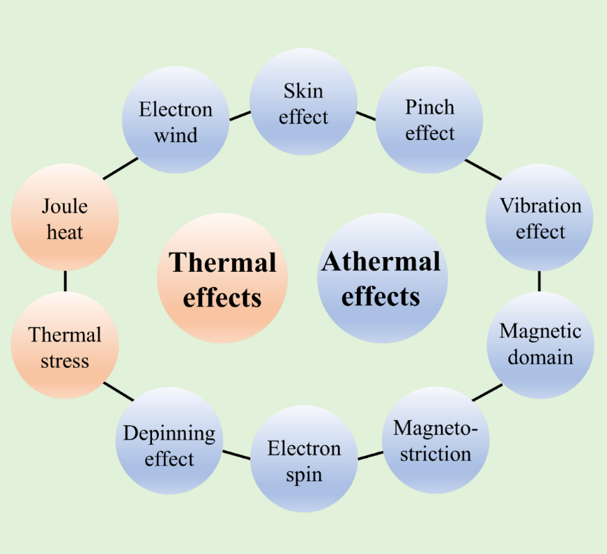电磁处理的特征包括电磁处理的能量生成与传递、靶向性、极端时空尺度特性、缺陷修复等,如图1。电磁处理的作用机制主要包括热效应和非热效应:热效应主要指焦耳热效应和热应力效应;非热效应则包括一系列不依赖材料加热的物理现象,如电子风效应,集肤效应,磁致振动效应,磁畴演变,磁致伸缩效应,电子自旋,位错脱钉等,如图2。