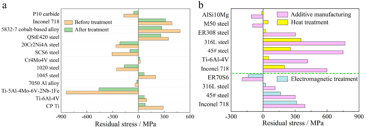 图11 电磁处理前后残余应力变化以及电磁处理对增材制造零部件残余应力的影响