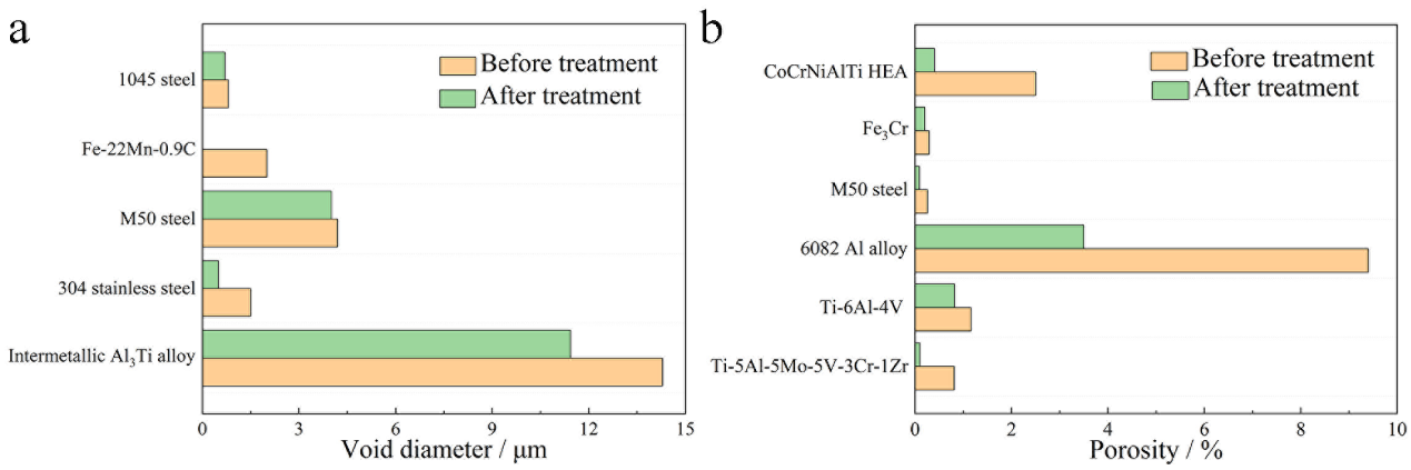 电磁处理能够诱导金属材料微观结构的多维演变,包括晶粒尺寸与晶界变化、相变与相组成演化、缺陷演变、再结晶行为、织构演变以及应力应变分布等。作为一种非接触式外场调控手段,电磁场可在不改变构件尺寸的前提下高效、环保地调控金属材料的微观结构与力学性能。研究表明,电磁场作用可改变液态金属形核条件,同时通过电磁搅拌效应实现晶粒细化。电磁场的方向与相对磁导率对晶粒生长和织构演变具有显著影响。特定取向晶粒在电磁场作用下会呈现择优生长特性。钉扎障碍与位错产生的自由基对在电磁场作用下可从S态转变为T态,从而提升位错运动能力并增强材料塑性。电磁场对晶粒生长的调控呈现双重效应:动态电磁场在某些条件下促进晶粒长大,而在其他条件下则抑制晶粒生长。此外,电磁场可促进位错胞或亚晶界形成,其诱导的结构松弛效应能促使自由体积空位湮灭,为缺陷修复提供形核与扩展条件。电磁处理能够有效修复材料内部孔隙并降低孔隙率,消除材料内部缺陷,大幅延长构件服役寿命,如图3。多种金属材料经电磁处理后孔隙直径显著减小,材料孔隙率也呈现明显下降趋势。微观结构改善对材料性能提升具有重要影响。