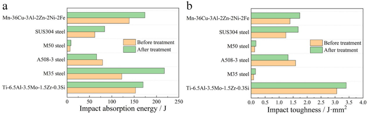 图7 电磁处理前后金属材料抗冲击韧性变化