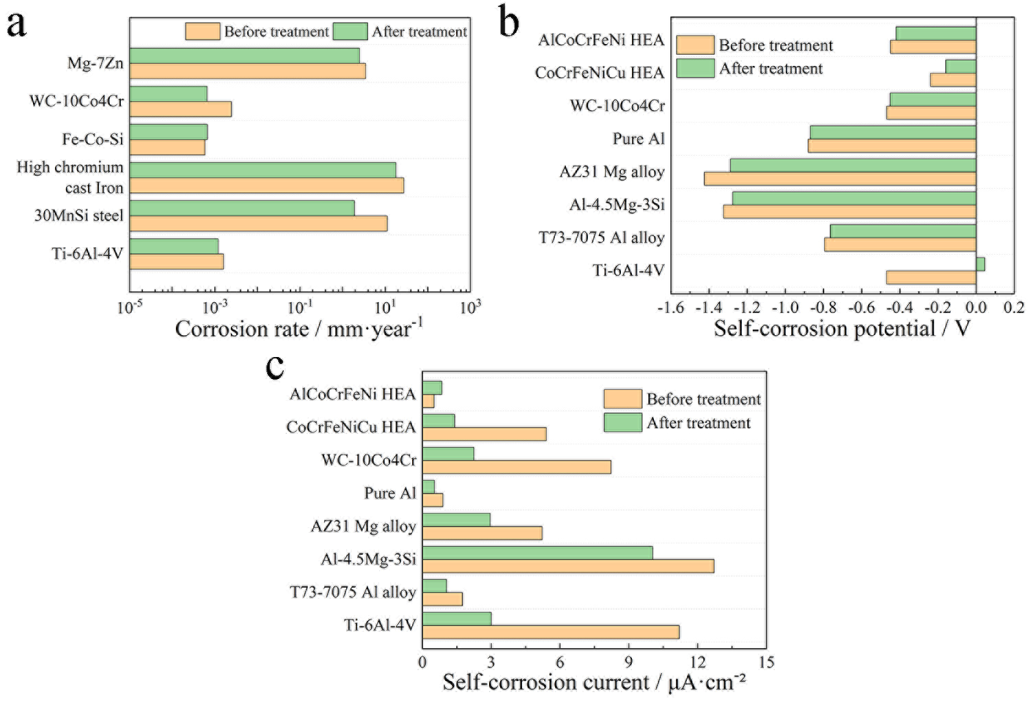 耐腐蚀性的改善源于晶粒细化、电化学效应的减弱以及致密钝化膜的形成。低强度磁场可以抑制点蚀,使腐蚀产物层更加致密。相反,高强度磁场可能会加速钝化膜的破坏并加剧腐蚀。短期的电磁处理有助于稳定钝化膜,迅速消除表面残余应力,并抑制腐蚀裂纹的萌生。非磁性材料在磁场中可能会由于电化学活性增加而加速腐蚀。这些机制的协同作用全面优化了金属材料的强度、韧性和耐久性。电磁处理前后拉伸性能、疲劳寿命、耐磨性能、冲击韧性以及抗腐蚀性能的变化如图4-图8所示。