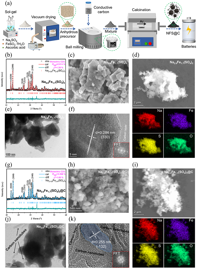 图1:展示了通过液-固协同法合成Alluaudite型Na2.6Fe1.7(SO4)3及其碳包覆材料Na2.6Fe1.7(SO4)3@C的制备路径,并通过XRD精修、SEM/TEM表征系统研究了二者的晶体结构与微观形貌特征。