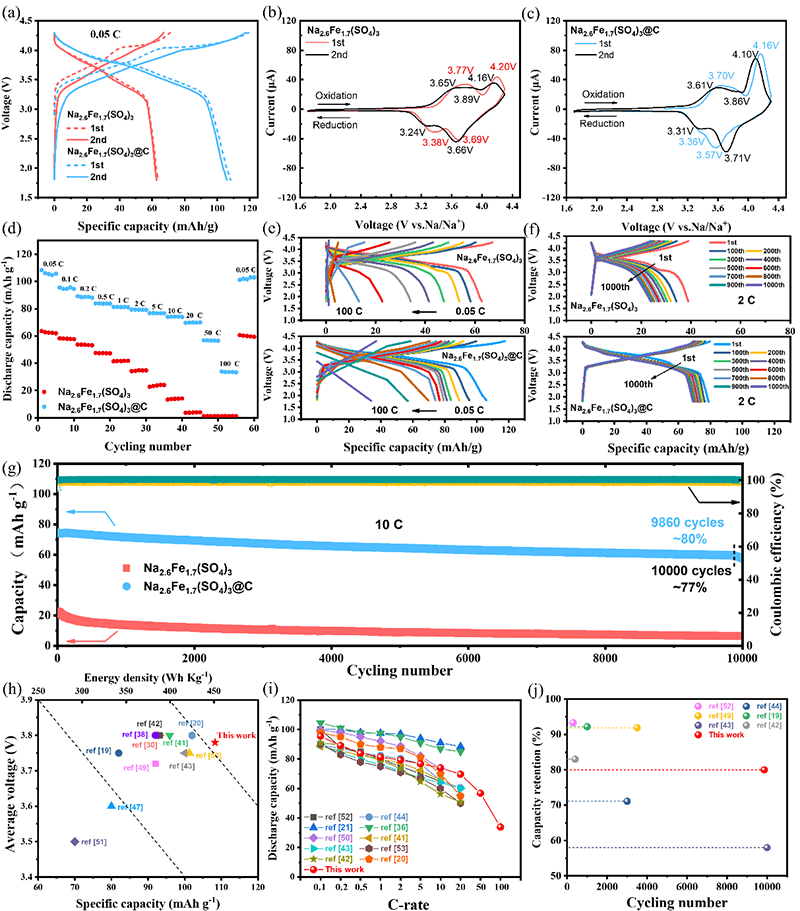 图2:系统评估了Na2.6Fe1.7(SO4)3与Na2.6Fe1.7(SO4)3@C的电化学性能,包括倍率性能、循环稳定性、能量密度与容量保持率等方面的综合对比。