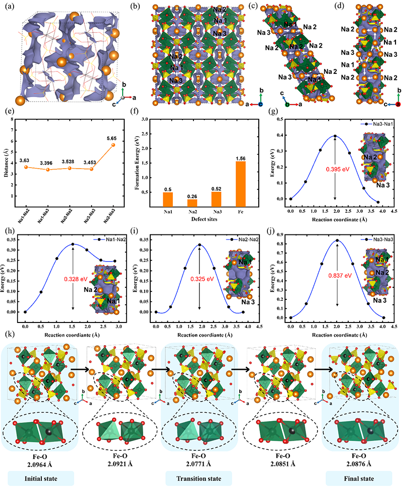 图3:通过DFT与BVS计算系统揭示了Na2.6Fe1.7(SO4)3中多维Na+迁移通道、扩散路径及其能垒变化,深入解析了Na+的脱嵌机制及相关结构响应。