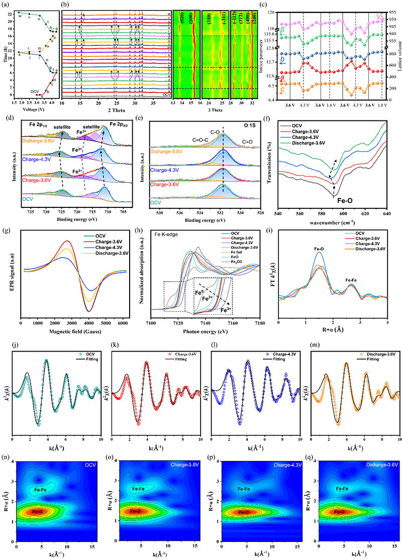图4:通过XRD、XPS、FT-IR、EPR及XAS等多种表征手段系统揭示了Na2.6Fe1.7(SO4)3@C在不同电化学状态下的结构演变与电子态变化。