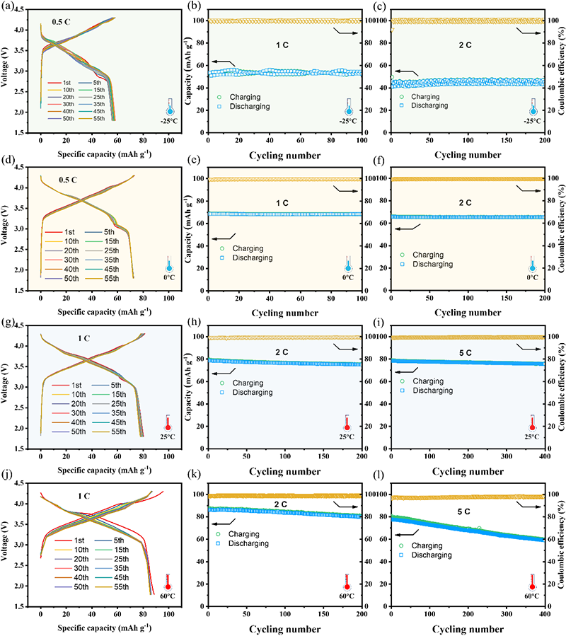 图5:系统展示了Na2.6Fe1.7(SO4)3@C正极在−25°C至60 °C的宽温域范围内的倍率性能与循环稳定性,验证其优异的宽温适应性。