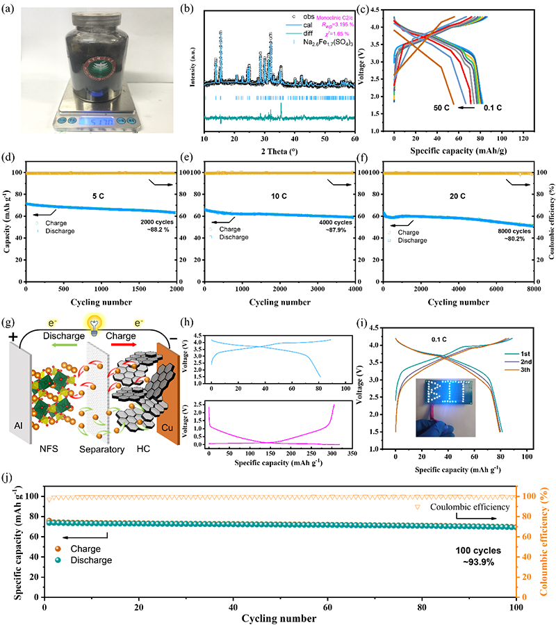 千克级产物依然保持纯相Na2+2δFe2−δ(SO4)3结构,与克级样品高度一致,证实该方法具备良好的批量稳定性。该千克级Na2.6Fe1.7(SO4)3@C材料在高倍率50 C下仍能提供约60 mAh g−1的放电比容量,展现出卓越的倍率性能。同时,在多种倍率下均表现出优异的长循环稳定性,在5 C、10 C与20 C倍率下循环2000、4000与8000圈后,容量保持率分别达到88.2%、87.9%和80.6%。进一步将其与硬碳(HC)组装了全电池体系,首次放电容量达到约80 mAh g−1,库仑效率超过91%。在1 C倍率下循环100圈后,容量保持率高达93.9%,为其商业化应用奠定了坚实基础。