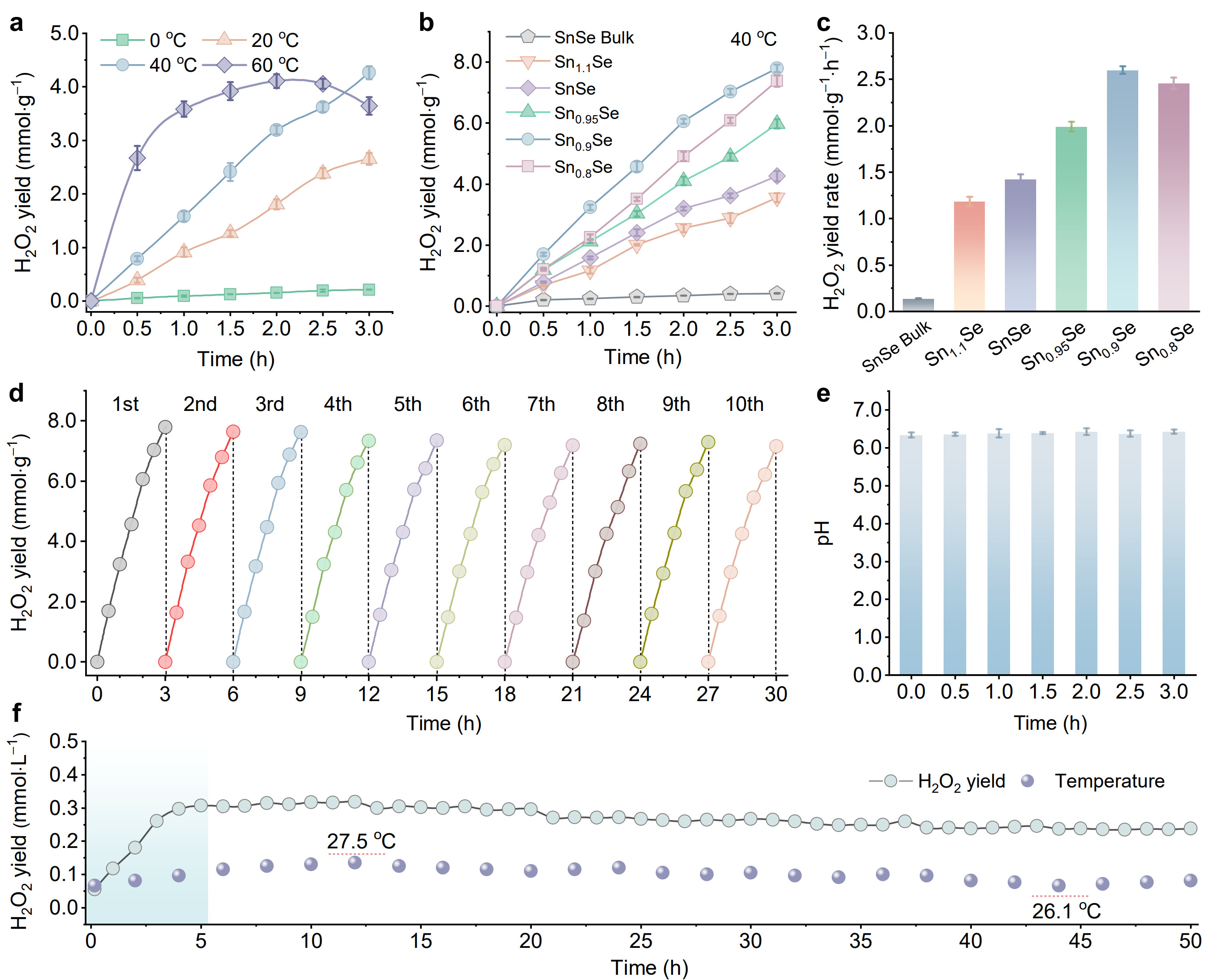 1.温度依赖催化性能测试:在0-60℃范围内,SnSe纳米片均可催化水和氧气制备H2O2,产率随温度升高而增加,60℃后因H2O2热分解产率下降(图1a)。