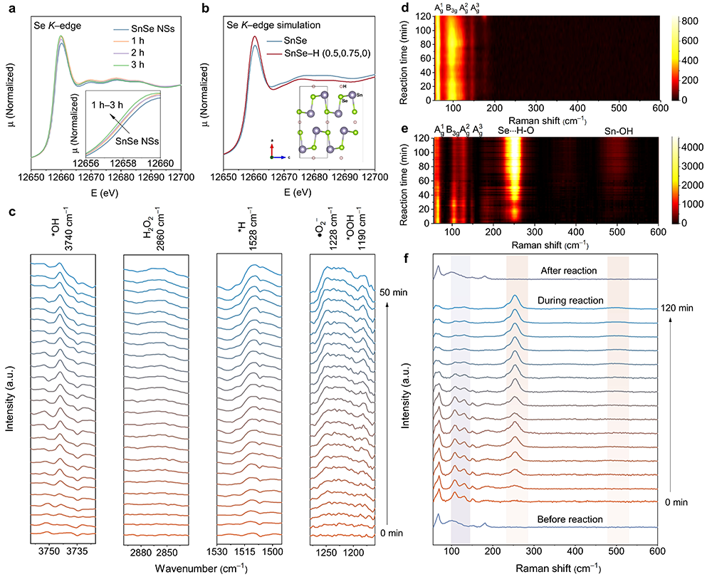 3.原位拉曼光谱:反应过程中出现Se∙∙∙H-O(252.9 cm⁻¹)和Sn-OH(495.8 cm⁻¹)振动峰,直接证明水分子在催化剂表面解离(图3e-f),证实了SnSe发生了表面重构。