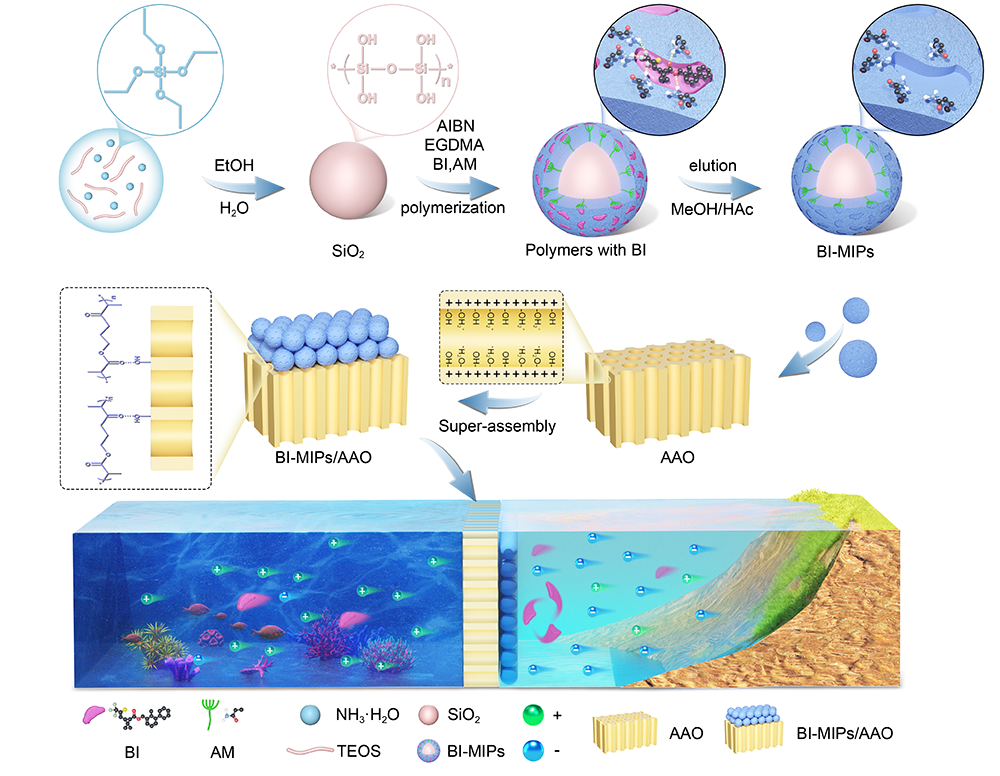 图1. BI-MIPs/AAO分子印迹纳米通道膜的合成示意图。