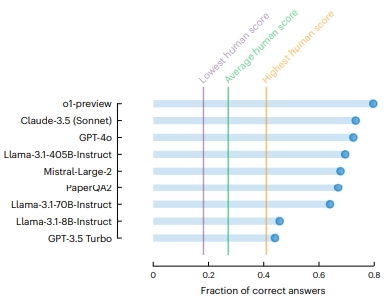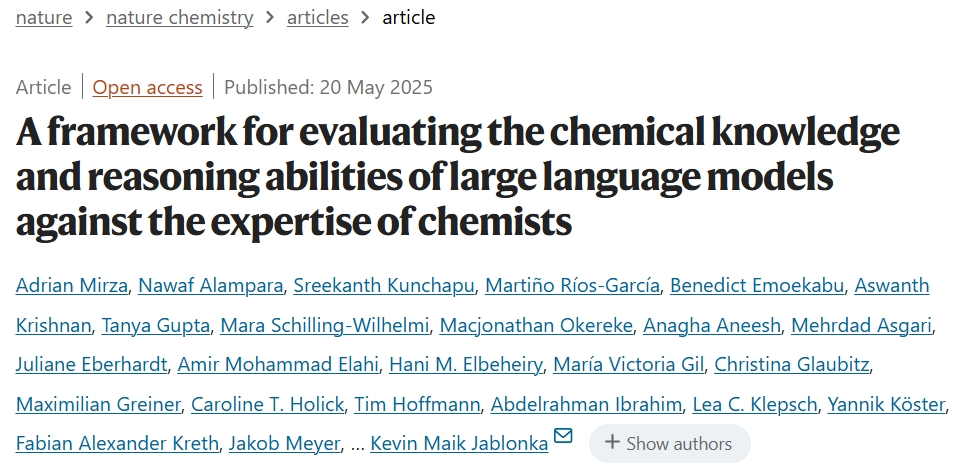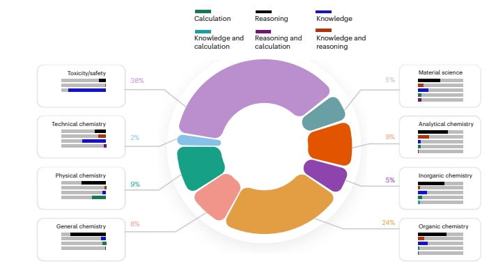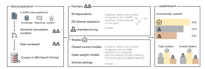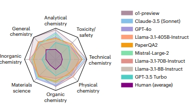 一方面,研究成果强调了大语言模型在化学科学中的强大能力:领先的模型在许多主题的具体化学问题上超越了领域专家。另一方面,仍存在显著的局限性。对于非常相关的话题,模型提供的答案是错误的。此外,许多模型无法可靠地估计自身的局限性。