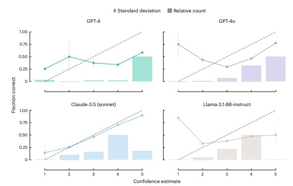 4.自信度评估与校准研究:通过提示模型自我评估信心水平,发现其自信度与答案正确率脱节,为安全应用中的不确定性管理提供洞见。