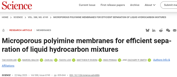原文详情:Microporous polyimine membranes for efficient separation of liquid hydrocarbon mixtures (Science 2025, 388, 839-844, DOI: 10.1126/science.adv6886)