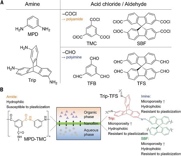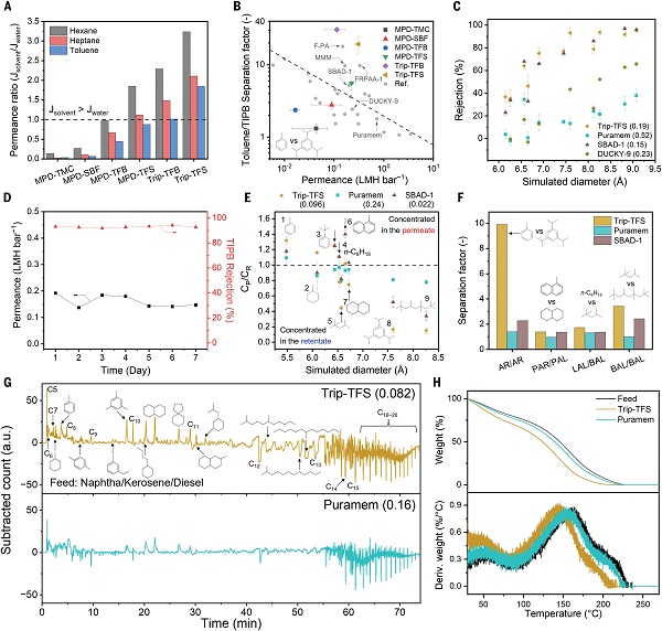 几十年来,界面聚合TFC膜彻底改变了水净化行业。然而,将同样的概念扩展到复杂有机混合物的分离仍然是一个巨大的挑战。本研究通过界面聚合作用,引入新的亚胺键和微孔发生装置是一种有用的策略,可用于开发具有良好尺寸选择性、抗塑化和无氟的OSRO膜,用于原油分馏。多组分和真实混合物的渗透试验表明,Trip TFS膜能够以中等渗透性高效地按碳原子数对烃分子进行分馏。