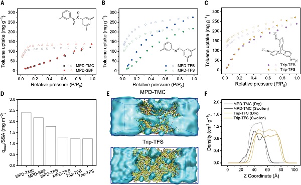 受用于分离水和盐分离的RO膜材料启发,美国麻省理工学院Zachary P. Smith教授团队在Science上发表了题为“Microporous polyimine membranes for efficient separation of liquid hydrocarbon mixtures”的论文,报告了一种基于酸催化界面聚合的分子工程方法,用于高效分离烃类化合物。设计策略包括(i)以亚胺键替代酰胺键来降低亲水性及传统聚酰胺膨胀和抗塑性不足;(ii)引入三庚烯和螺二芴等形状持久性单元。具体地,研究人员为了制备聚亚胺TFC膜,使用MPD和三胺三联苯(Trip)作为胺单体,同时将酰氯单体(TMC和SBF)更改为醛单体,分别为均苯三甲醛(TFB)和四甲醛螺二芴(TFS)。与常规聚酰胺相比,制备的聚酰亚胺膜具有超高的微孔性和增强的抗溶胀性和抗塑化性。此外,该聚亚胺膜展现出超高微孔性,其中Trip-TFS聚亚胺的分数自由体积(FFV)达到0.219,比目前报道的最微孔聚酰胺TBD-SBF(0.204)还高,甚至与线性PIM-1(0.230)相当。在纯烃溶剂的渗透测试中,Trip-TFS对甲苯的渗透率达到0.41 LMH bar-1,比对照的聚酰胺MPD-TMC(0.093 LMH bar-1)高出340%,对正己烷和正庚烷等烃类溶剂的渗透率也显著高于水,表现出极高的渗透性能。这些膜具有快速和选择性传输烃类化合物的特点,包括多组分和工业相关的混合物,其性能优于商业和最先进的基准膜。