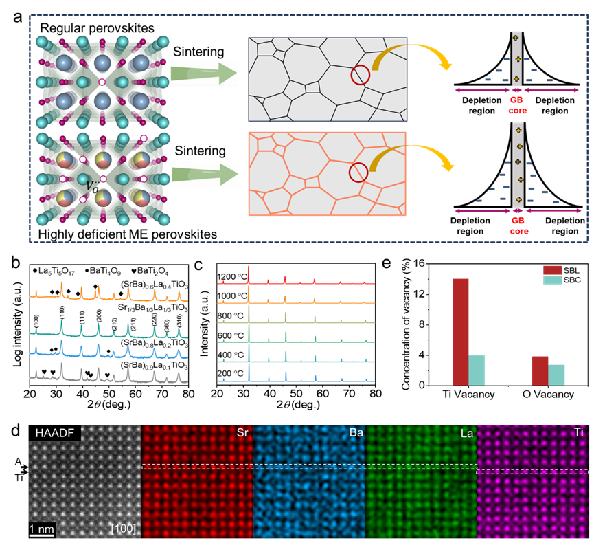 图1中熵钙钛矿陶瓷的物相与结构。(a)传统与高缺陷中熵钙钛矿陶瓷烧结后晶界差异示意图。(b)随La含量增加的钙钛矿陶瓷XRD图谱。(c)SBL陶瓷随退火温度升高的XRD图谱。(d)SBL钙钛矿的HAADF-STEM图像及元素分布原子级EDS图谱。(e)SBL与SBC陶瓷中Ti空位和O空位浓度对比。