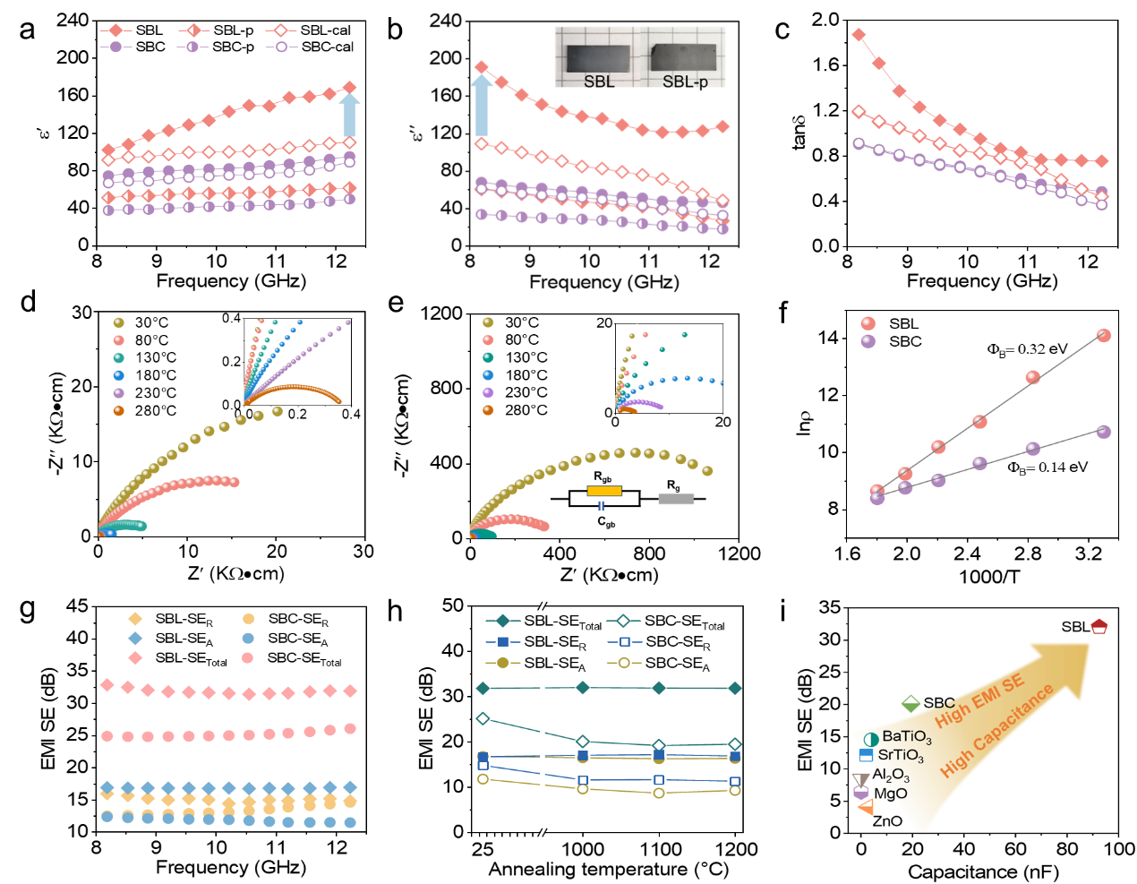 图2中熵钙钛矿陶瓷的介电性能与电磁屏蔽性能。(a-c)中熵钙钛矿粉体、陶瓷及理论块体材料的介电常数(ε’)、介电损耗(ε”)及损耗角正切(tanδ)的频率依赖性。(d-e) SBC与SBL钙钛矿陶瓷在不同温度下测量的阻抗奈奎斯特图。(f) SBC和SBL陶瓷的晶界势垒高度。(g) X波段室温测量的中熵钙钛矿陶瓷电磁屏蔽效能。(h)不同温度退火处理后中熵钙钛矿陶瓷的电磁屏蔽效能。(i)各类氧化物陶瓷电磁屏蔽性能与电容特性的对比分析。