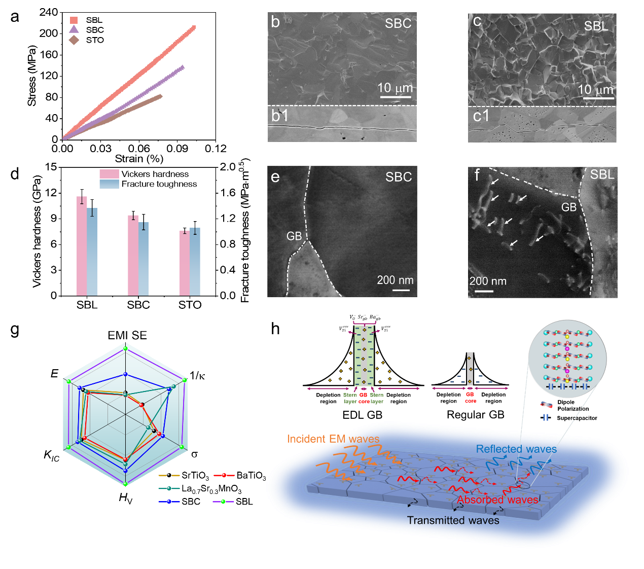 图4中熵钙钛矿陶瓷的力学性能。(a)钙钛矿陶瓷的应力-应变曲线。(b,c)中熵钙钛矿陶瓷的断口形貌及(b1,c1)裂纹扩展路径。(d)钙钛矿陶瓷的维氏硬度与断裂韧性。(e,f)中熵钙钛矿陶瓷中的位错结构。(g) X波段电磁屏蔽效能(SE)、热阻率(1/κ)、抗弯强度(σ)、维氏硬度(HV)、断裂韧性(KIC)和杨氏模量(E)与其他钙钛矿陶瓷的性能对比。(h)高缺陷中熵钙钛矿陶瓷实现优异力学和电磁屏蔽性能的机理示意图。