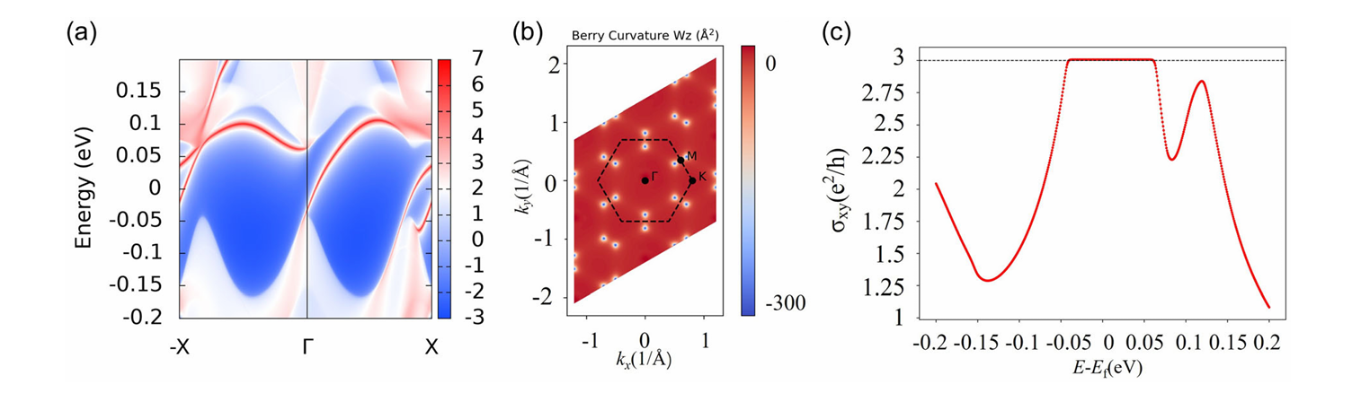 图2:单层Mn2Bi2O6的拓扑性质(a)边缘电子态密度(b)倒空间的贝里曲率分布。(c)费米能级附近的量子化的导电平台。