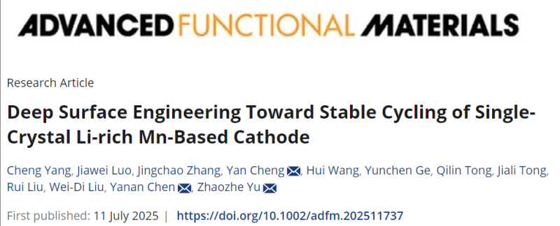 C. Yang, J. Luo, J. Zhang, Y. Cheng, H. Wang, Y. Ge, Q. Tong, J. Tong, R. Liu, W.-D. Liu, Y. Chen, Z. Yu, Deep Surface Engineering Toward Stable Cycling of Single-Crystal Li-rich Mn-Based Cathode. Adv. Funct. Mater. 2025, e11737. https://doi.org/10.1002/adfm.202511737