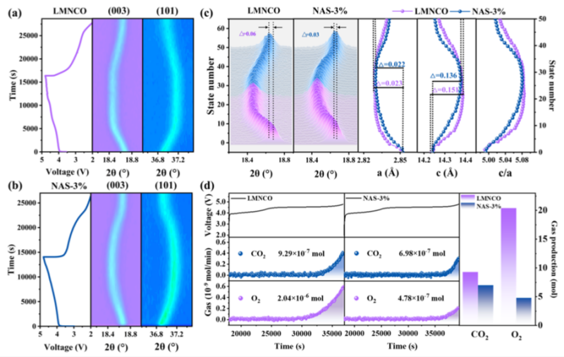 图3. (a) LMNCO电极和 (b) NAS-3%电极首次循环过程中的原位XRD等高线图、单峰拟合结果及对应电压曲线;(c) (003)衍射峰二维等高线图与晶格参数变化;(d) LMNCO与NAS-3%在首次充电至4.8 V过程中的原位DEMS测试