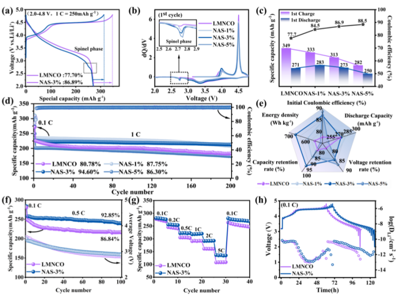 图2. (a) LMNCO和NAS-3%在0.1 C倍率下的首次充放电曲线;(b) 相应的dQ/dV微分容量曲线;(c) 0.1 C倍率下所有样品的首次充放电数据;(d) 1 C倍率循环性能对比;(e) 电化学性能雷达图;(f) LMNCO与NAS-3%在0.5 C倍率下的长循环性能;(g) LMNCO与NAS-3%的倍率性能;(h) GITT曲线及Li+扩散系数