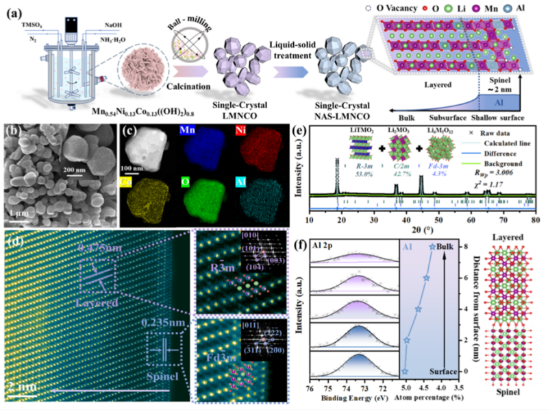 图1. (a) SLRMs合成与深度表面工程示意图;(b) NAS-3%的SEM图像;(c) NAS-3%的EDS元素分布图;(d) NAS-3%浅表层与体相的HAADF-STEM图像及对应FFT图谱;(e) NAS-3%的XRD图谱Rietveld精修结果;(f) NAS-3%表面至体相Al 2p的XPS刻蚀谱及铝原子百分比随刻蚀深度的变化