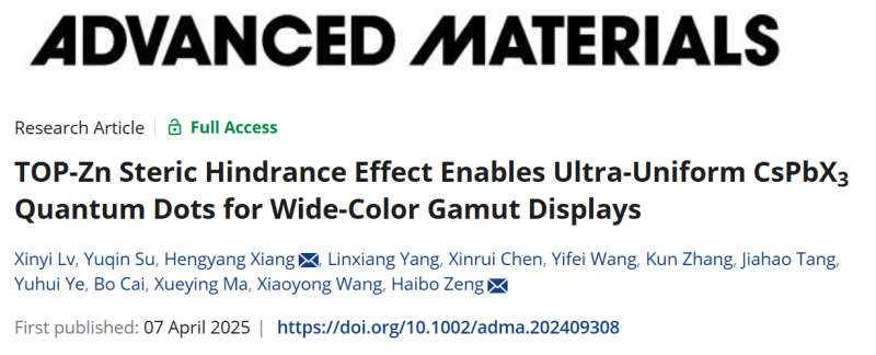 1. Lv, X., Su, Y., Xiang, H., Yang, L., Chen, X., Wang, Y., … & Zeng, H. (2025). TOP‐Zn Steric Hindrance Effect Enables Ultra‐Uniform CsPbX3 Quantum Dots for Wide‐Color Gamut Displays. Advanced Materials, 37(20), 2409308. https://doi.org/10.1002/adma.202409308