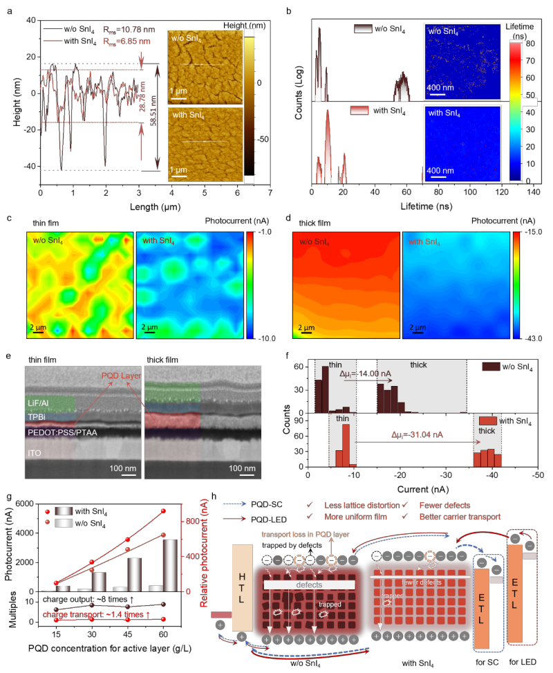 图4. 基于酰胺化延迟合成策略的钙钛矿量子点薄膜的形貌、光学和电学特。