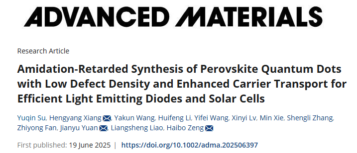 2. Su, Y., Xiang, H., Wang, Y., Li, H., Wang, Y., Lv, X., … & Zeng, H. (2025). Amidation‐Retarded Synthesis of Perovskite Quantum Dots with Low Defect Density and Enhanced Carrier Transport for Efficient Light Emitting Diodes and Solar Cells. Advanced Materials, 2506397. https://doi.org/10.1002/adma.202506397