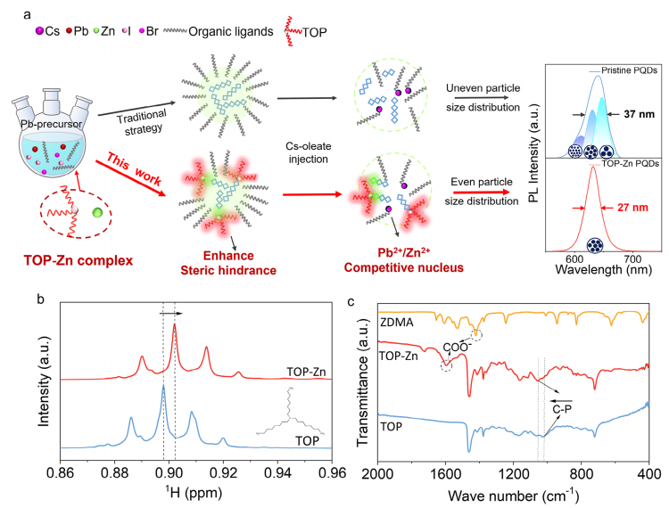 图 1、TOP-Zn CsPb (BrI)3钙钛矿量子点(PQDs)的合成示意图:通过在反应系统中引入TOP和Zn²⁺,形成了TOP-Zn复合物,显著增强了立体位阻效应,有效抑制了Cs⁺的乳化过程,促进了均匀的成核过程。