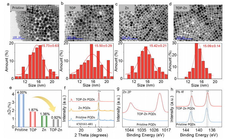 图 2、不同添加剂的 CsPb (BrI)3PQDs 的尺寸均匀性和结构表征。