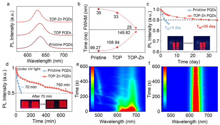 图 3、原始和 TOP-Zn CsPb (BrI)3PQDs 的光学性质。